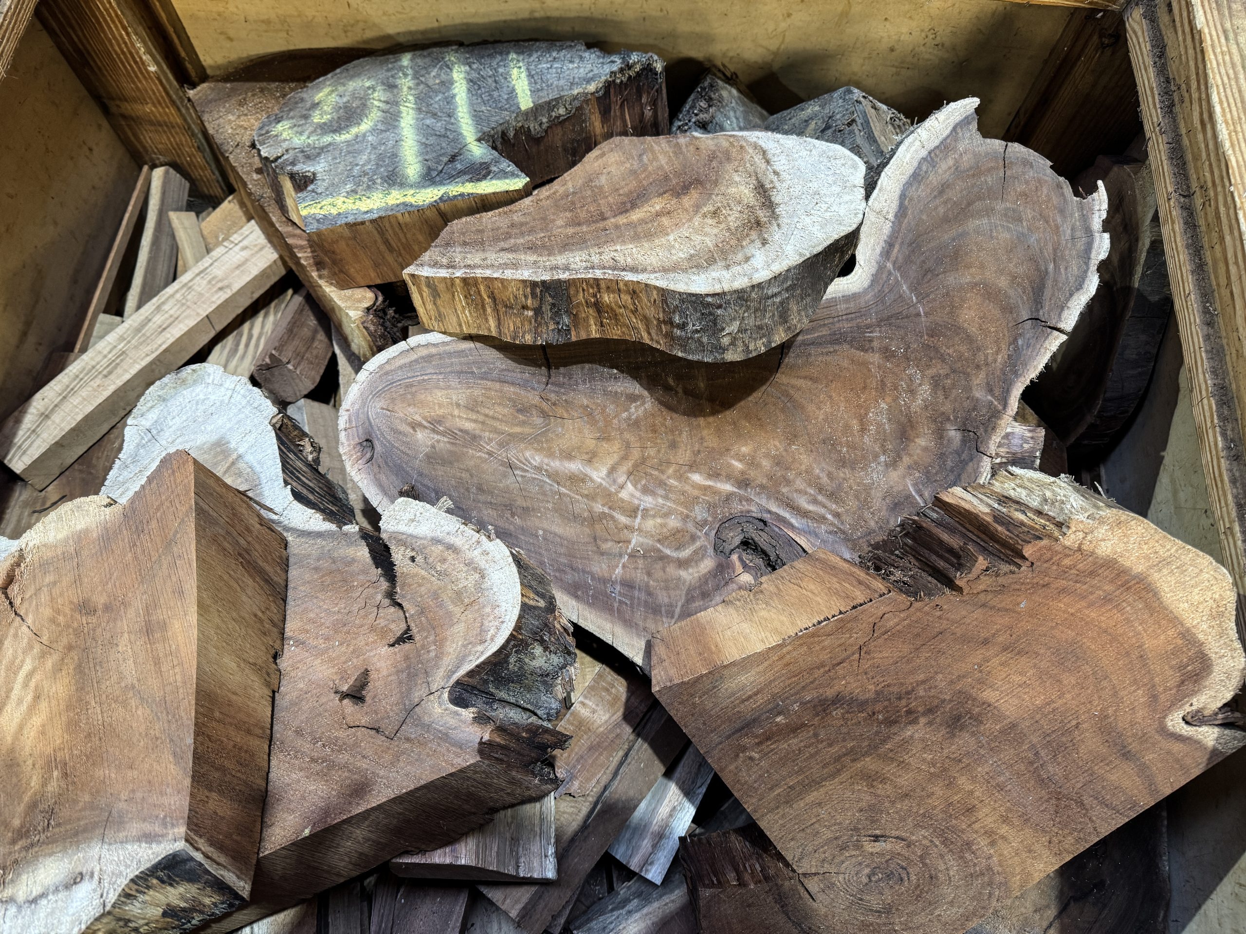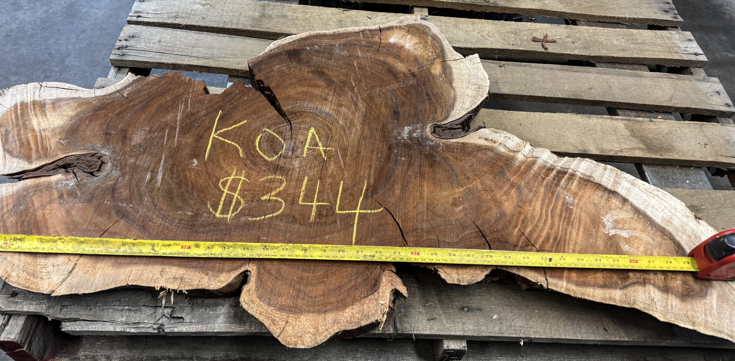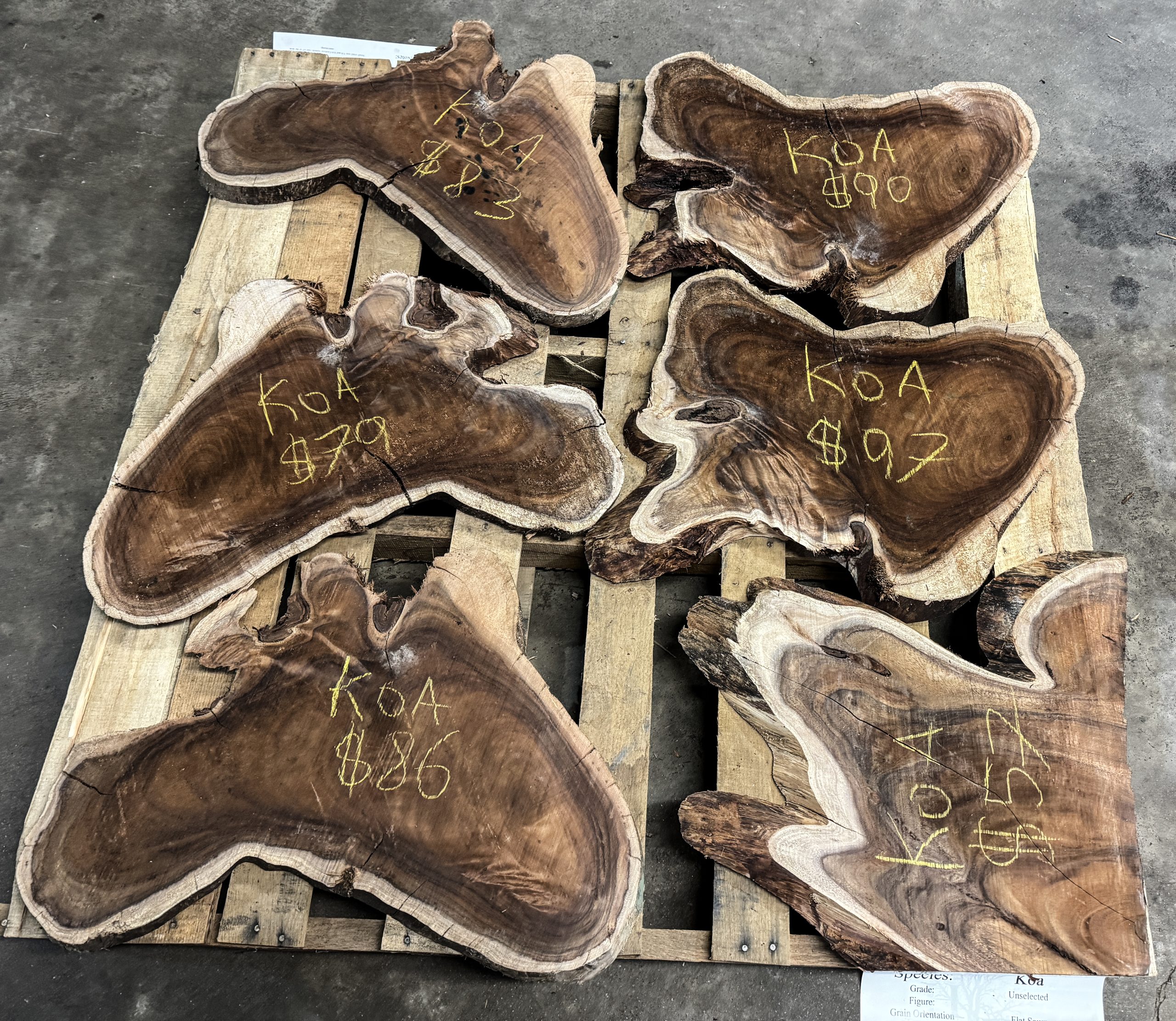 We have a dozen 4/4 koa cookies, 4 of the bigger ones sanded, all with some compression figure. We also have a couple planed 8/4 cookie chunks, and a larger one intact and unplaned. Several 8/4 and thicker cookies broke apart drying, which are available in the $4/lb bin.